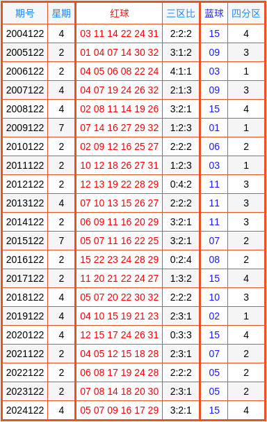 双色球历年第122期奖号分区详细数据