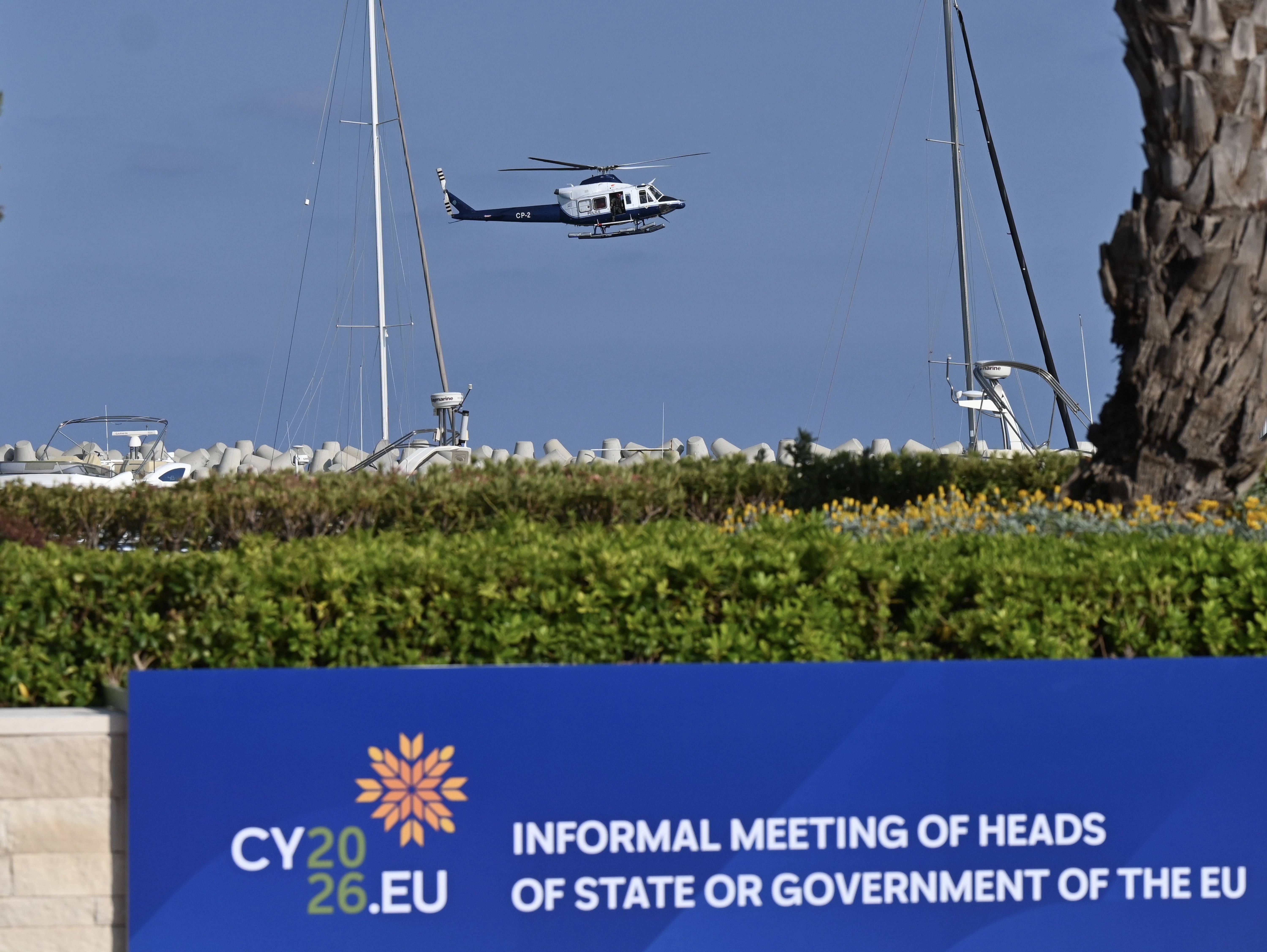 4月23日,在塞浦路斯圣纳帕,警用直升机在会场附近巡逻。新华社记者吕优摄23日至24日,为期两天的欧盟领导人非正式会议先后在欧盟轮值主席国塞浦路斯的海滨旅游胜地圣纳帕和首都尼科西亚举行。摆在桌面上的议题每个都不轻松:中东战事如何平息?霍尔木兹海峡能否通航?欧洲如何应对能源短缺和价格攀升?共同防务机制如何启动?下一轮长期预算如何分配?