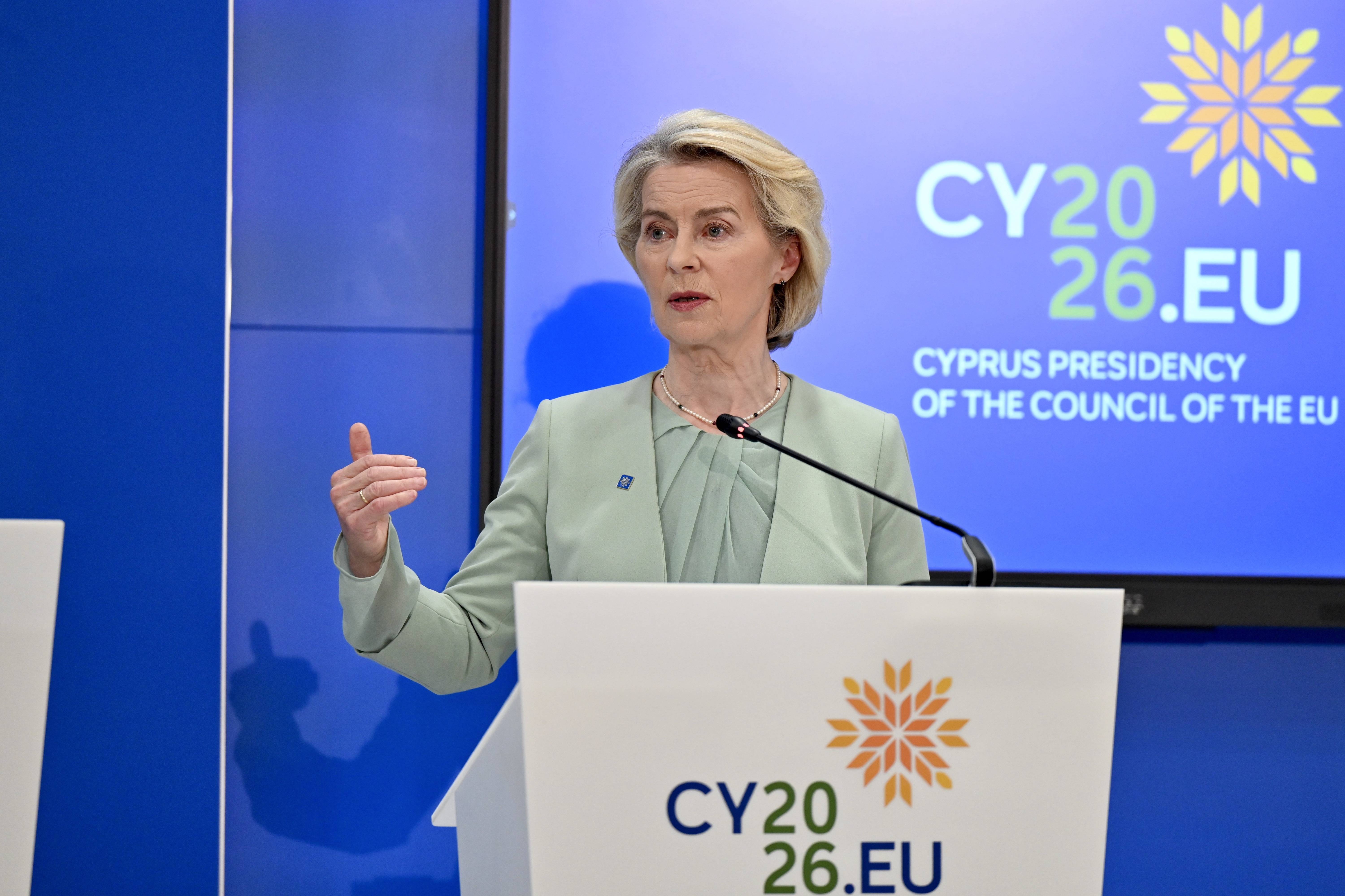4月24日,在塞浦路斯首都尼科西亚,参加欧盟领导人非正式会议的欧盟委员会主席冯德莱恩会后出席新闻发布会。新华社记者吕优摄这些分歧,正是本次会议的真实写照:中东问题,继续呼吁;能源问题,交给未来;共同防务,继续研究;长期预算,继续争吵。说得多,做得少;问题很急,反应很慢;各方都承认必须行动,但在真正行动之前,还要再开几轮会。