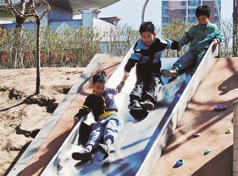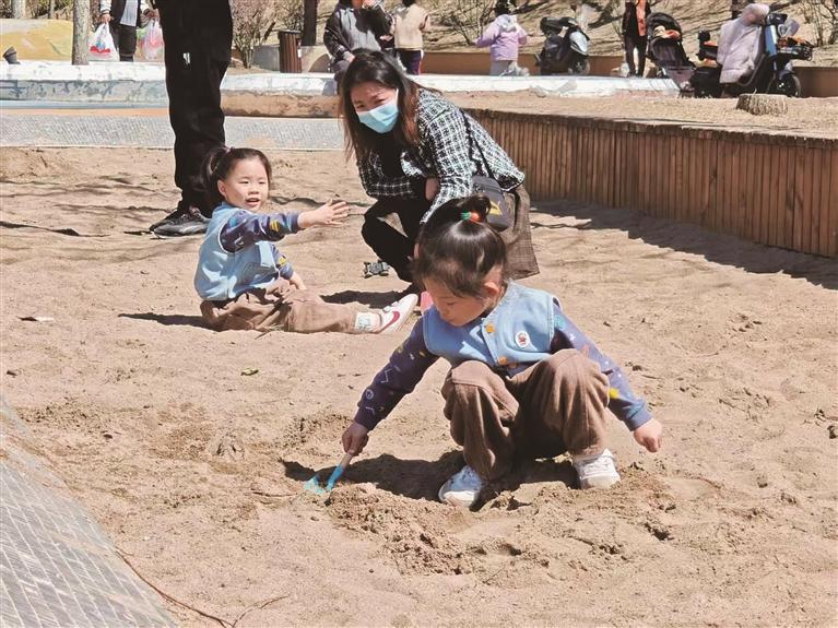 ② 武烈河畔的沙池内,小朋友在挖沙子。