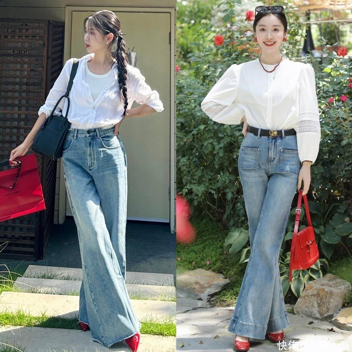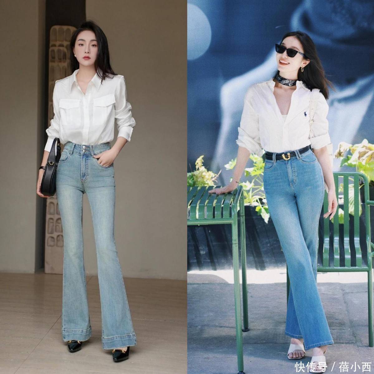 如果说牛仔直筒裤是清爽随性,那牛仔喇叭裤与白衬衫的组合,便自带复古滤镜,优雅又有气场,今年春天凭借独特的韵味火遍时尚圈。高腰喇叭裤的剪裁堪称 “身材作弊器”,上窄下宽的设计,紧紧贴合腰臀,从膝盖处微微散开,能藏住腰腹赘肉,又能修饰小腿线条,走路时裤脚随风摆动,摇曳生姿,尽显女性柔美。