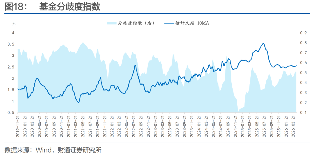 本周久期分歧度下降,市场一致性预期略有上升。4月17日公募基金久期分歧度较4月10日下降0.01至0.503。